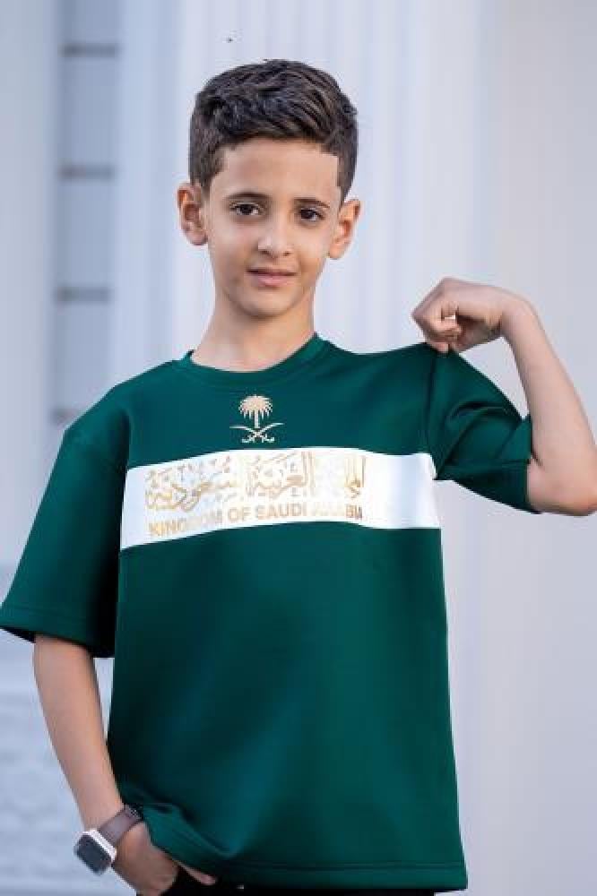 ●تصميم أوفر سايز: تيشرت أخضر بتدخيلات قماش أبيض مصنوع من القطن يتميز بقصة أنيقة مناسب للأطفال خصيصًا لليوم الوطني.